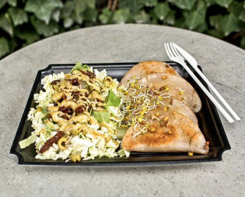 Smażone pierogi z ciecierzycą, szpinakiem i suszonymi pomidorami. Podane z surówką. 300 g