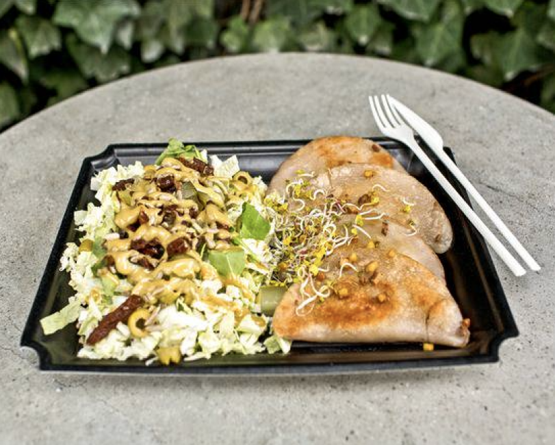 Smażone pierogi z ciecierzycą, szpinakiem i suszonymi pomidorami. Podane z surówką. 300 g